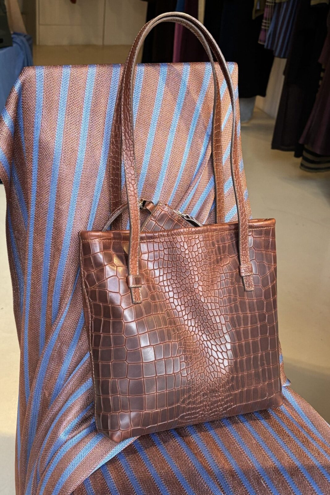 TL 180 everyday tote bag in croco-embossed vegetable tanned leather. Minimal and ergonomic tote bag embellished with a detachable zip pouch.