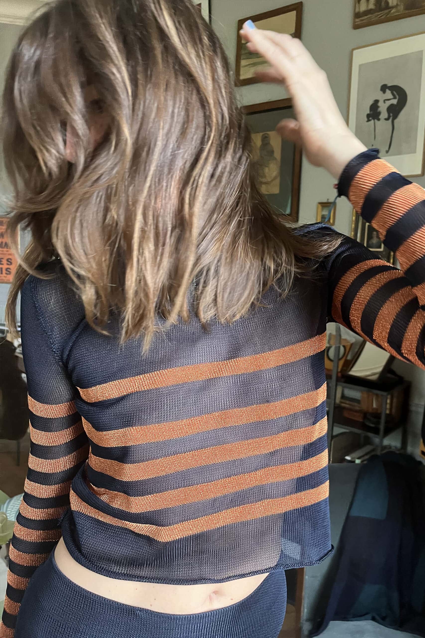 TL 180 turtle neck knitted see-through top in bright viscose embellished with contrast metallic stripes.