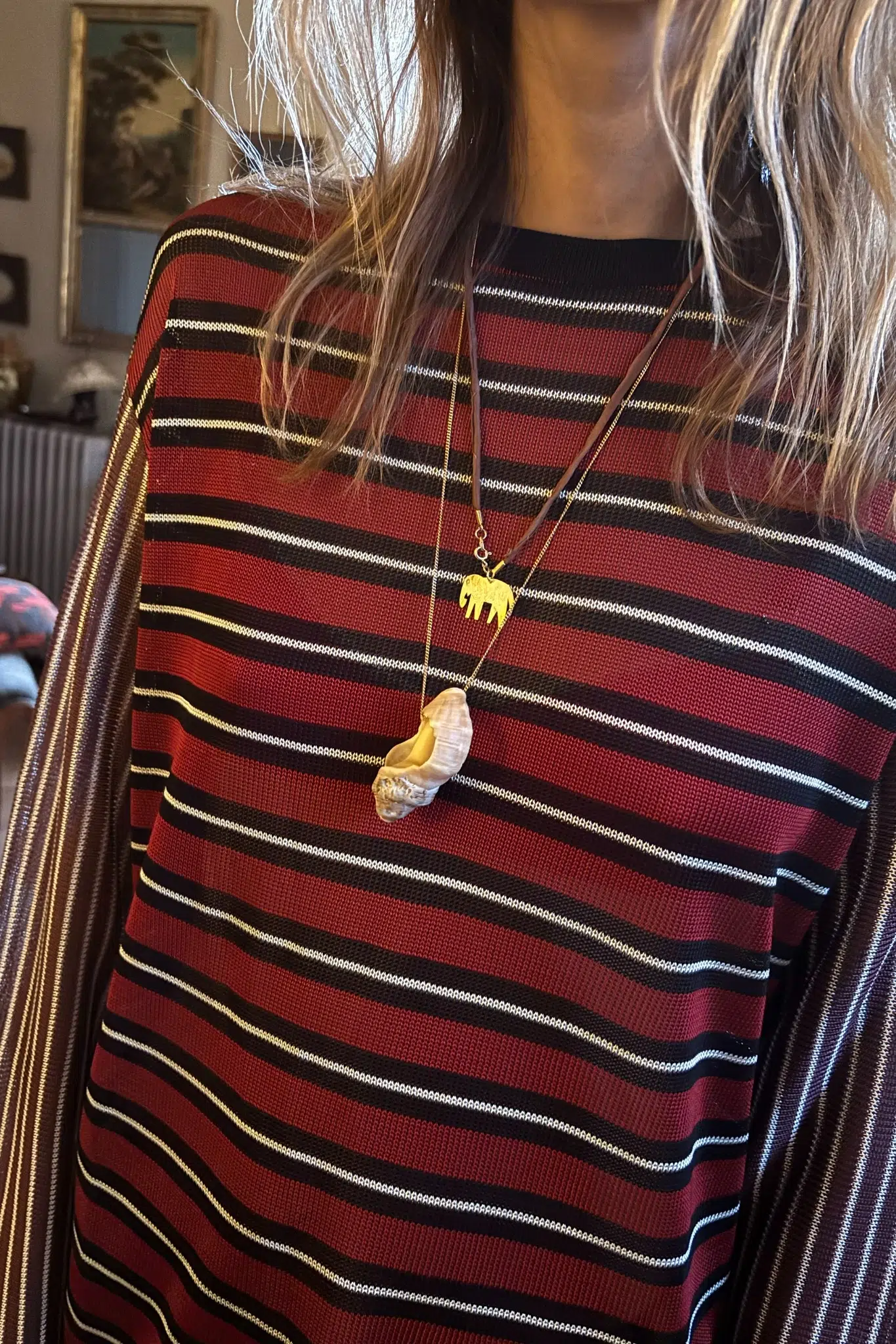 TL 180 loose top crafted in bright viscose knit, featuring a dynamic interplay of vertical and horizontal stripes. The relaxed silhouette, with a classic crew neckline and softly flared long sleeves, brings ease and understated volume. A versatile piece designed to wear across seasons.