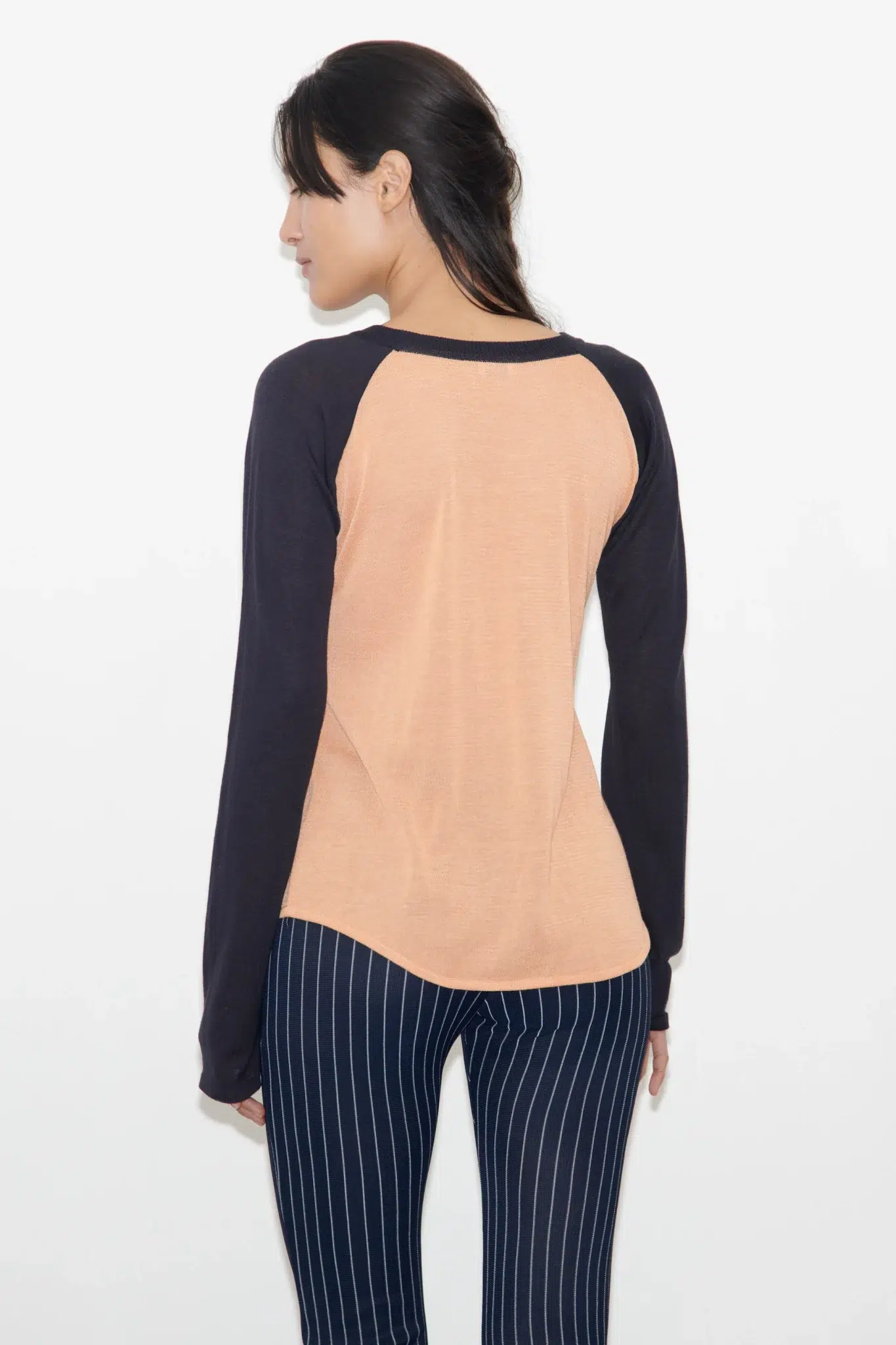 Long sleeve knitted top in a soft viscose and wool blend with contrasting raglan sleeves and a V insert below the neckline.