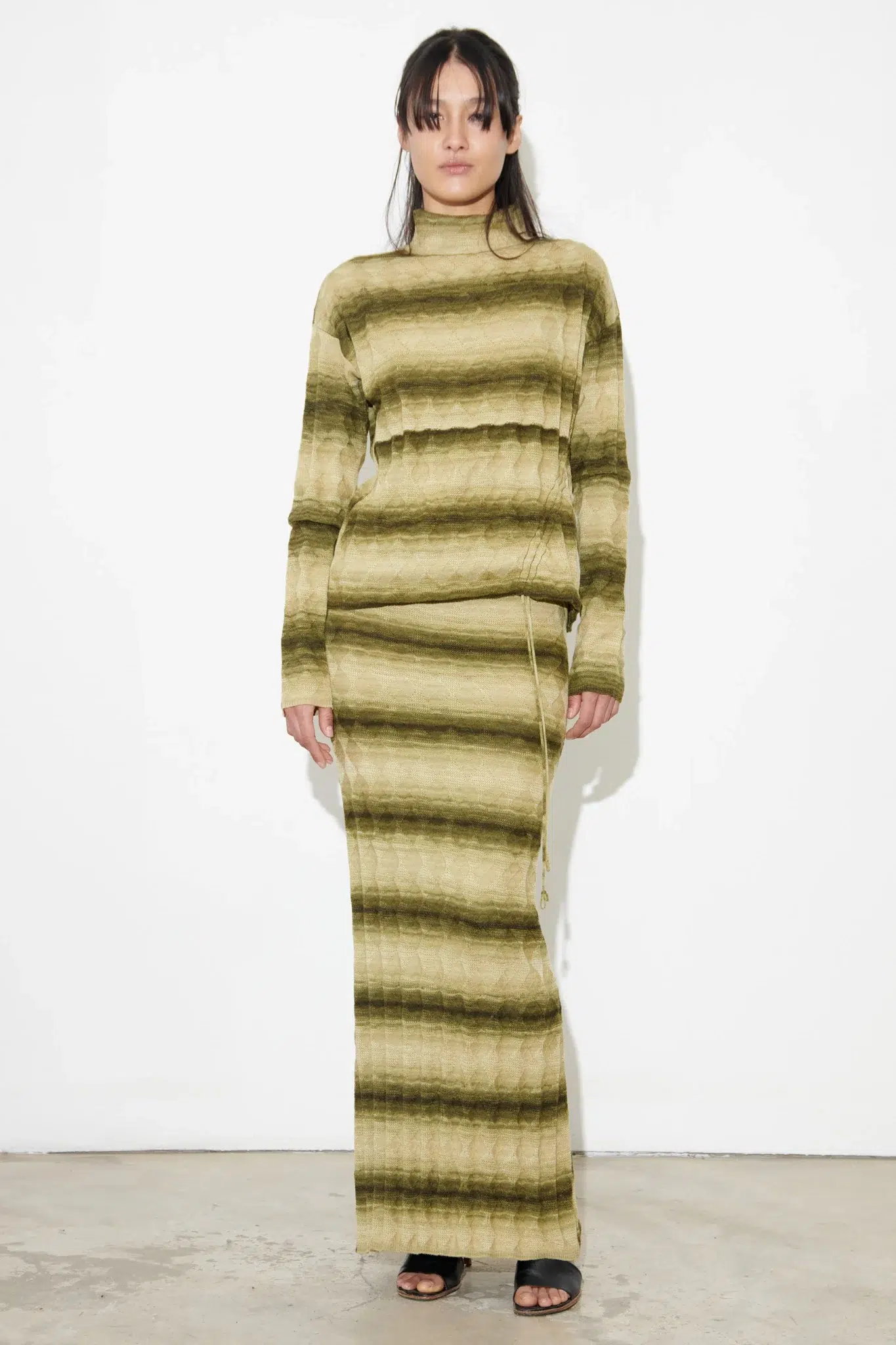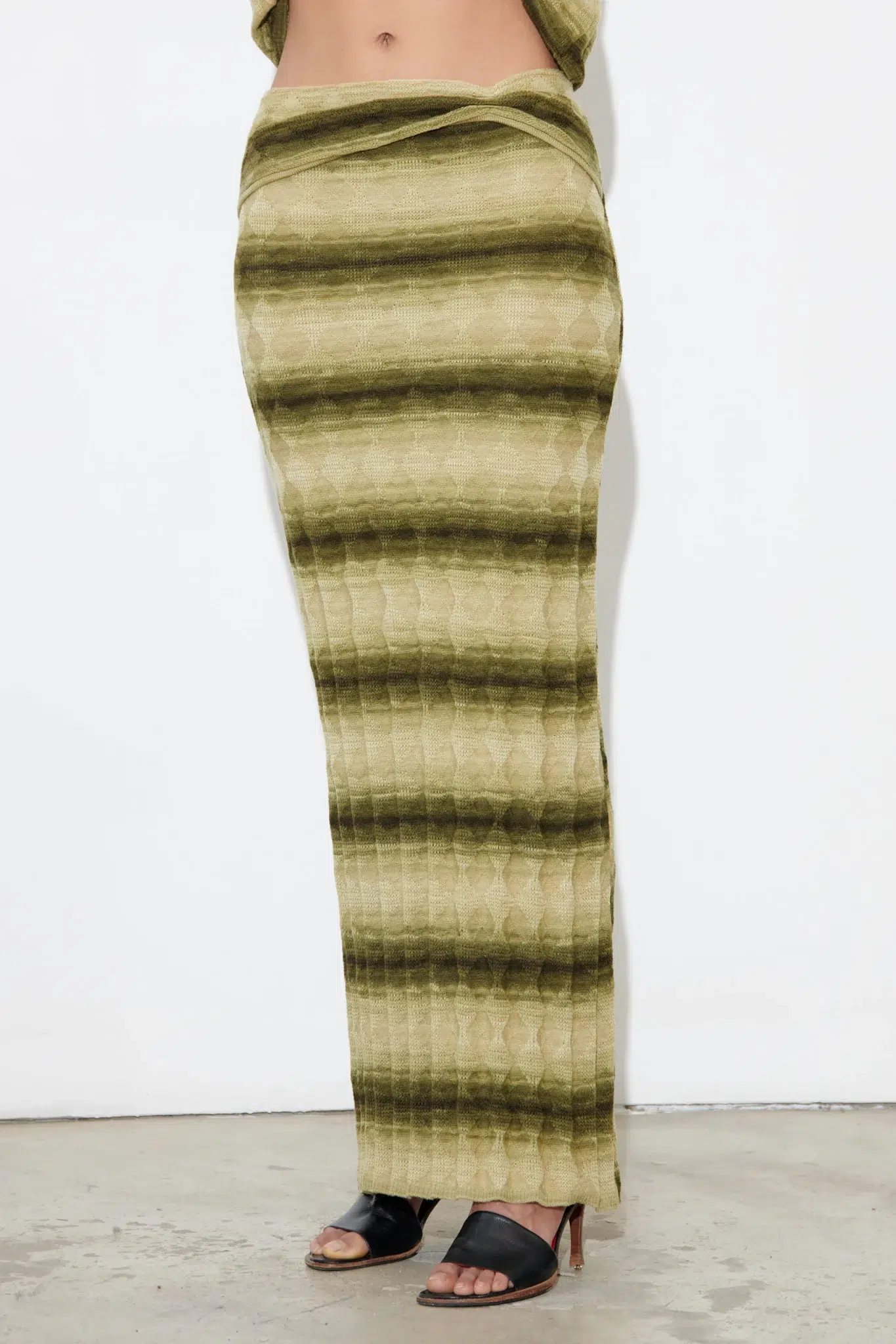 Knitted long skirt in soft merino wool with a diamond textured knit. Asymmetrical waist shaped by fine pinces.