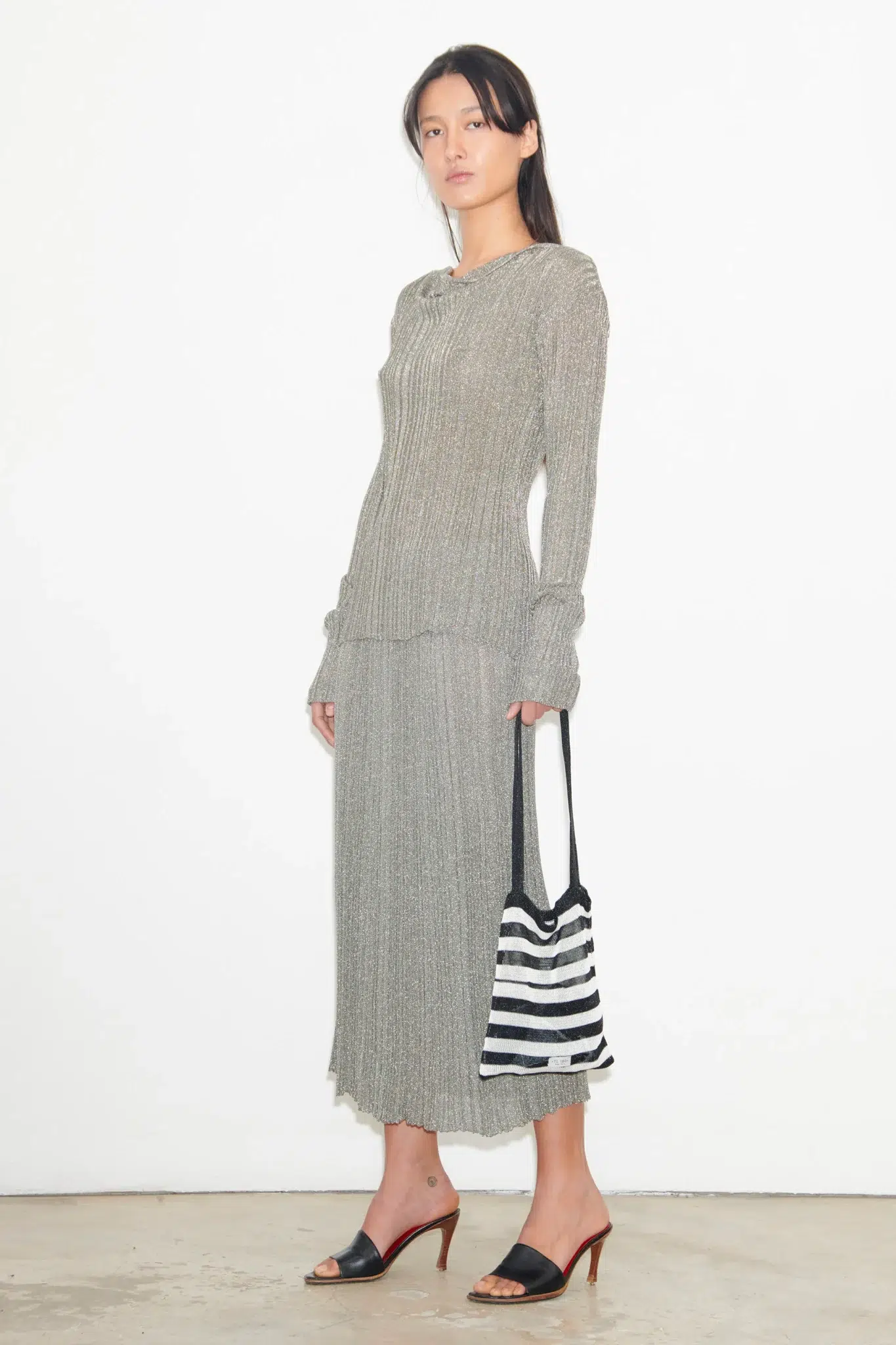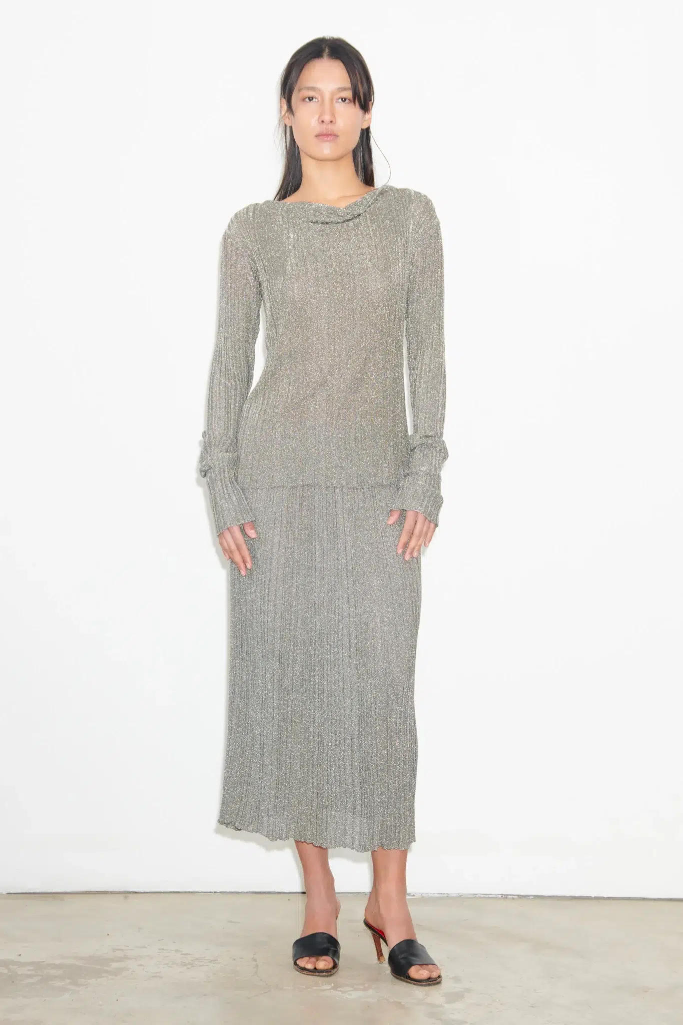 Long sleeve knitted top in metallic yarn with an irregular rib knit. Softly draped neckline and a fluid silhouette.