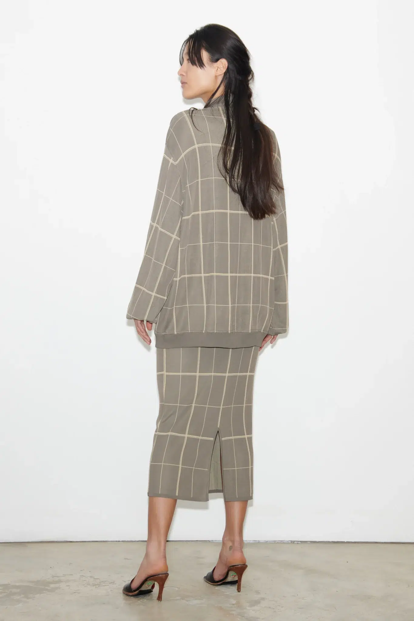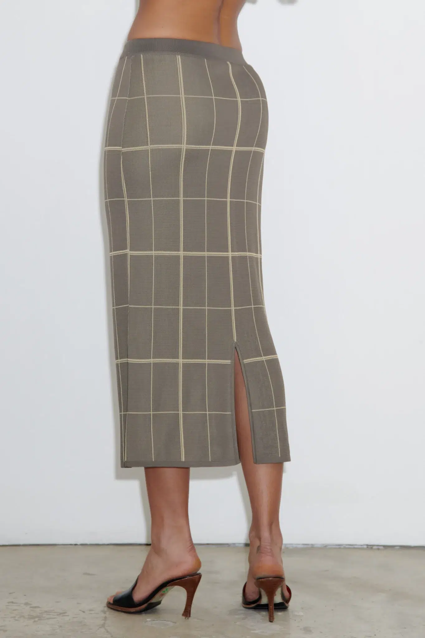 Mid length knitted cigarette skirt in a soft checked jacquard viscose with a back slit.