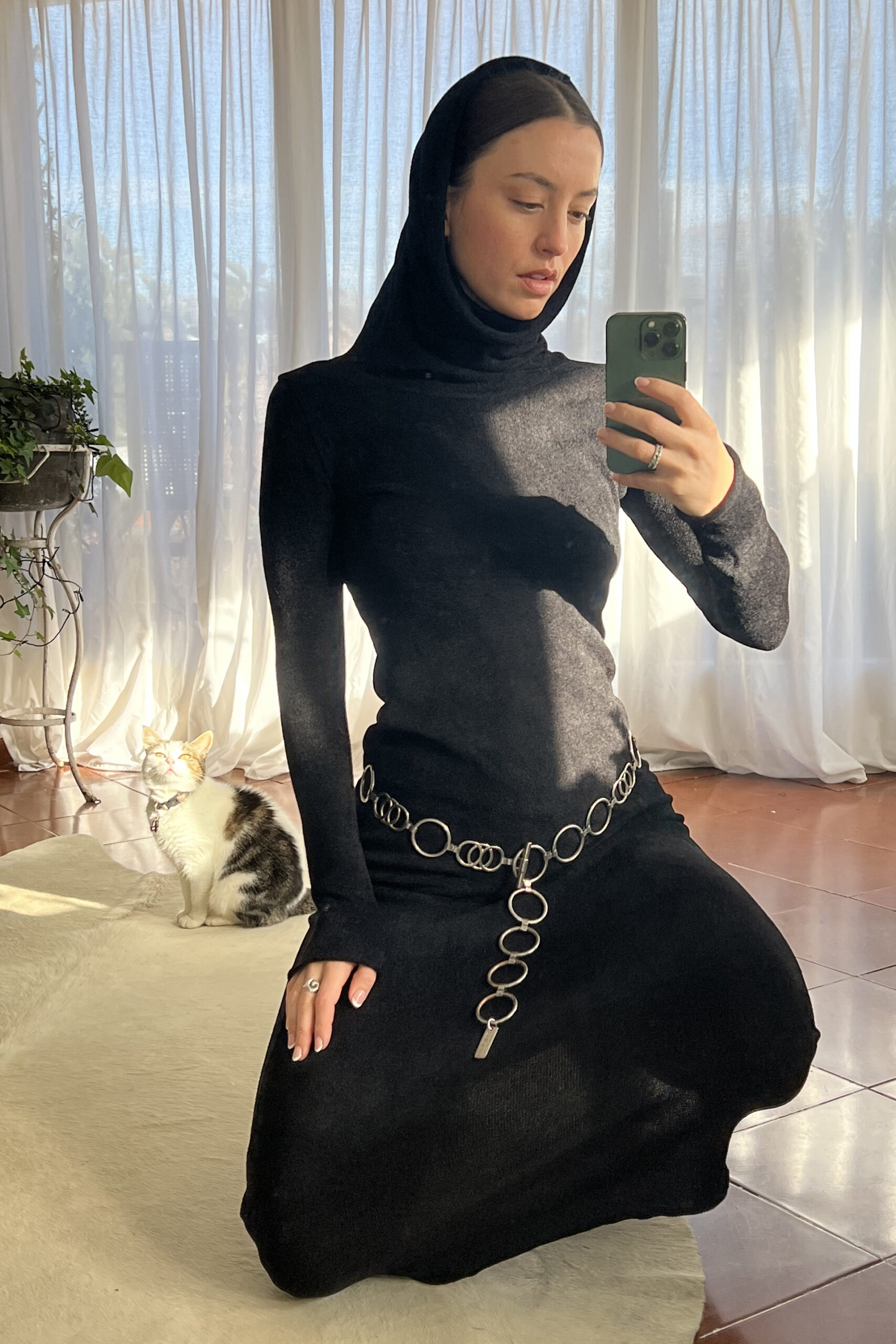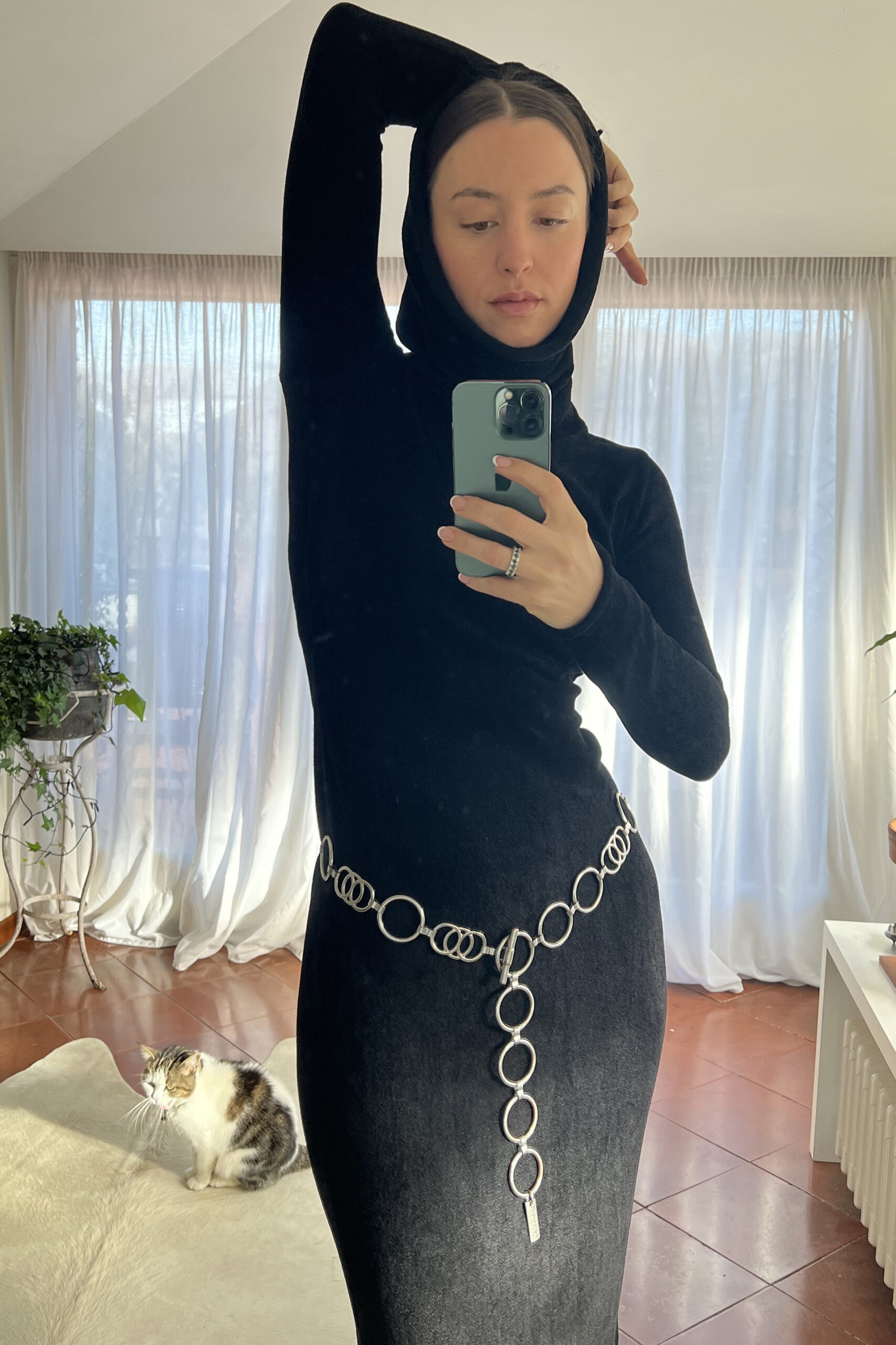 TL 180 knitted long dress in opaque velvettino. Embellished with a roll-neck also wearable as a hood.